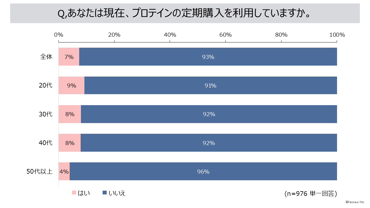 お客さまの声を最先端の分析でファン増加につなげる企業、株式会社ファンくる(本社:東京都千代田区、代表取締役社長:山口敬人)は、「ファンくる」会員を対象に、定期的に消費者の意識調査を実施しています。今回はプロテインについて、プロテインブランドの乗り換え経験や、1か月あたりでプロテインに使う金額などを「ファンくる」会員973名(男性253名、女性720名)に調査を実施しました。