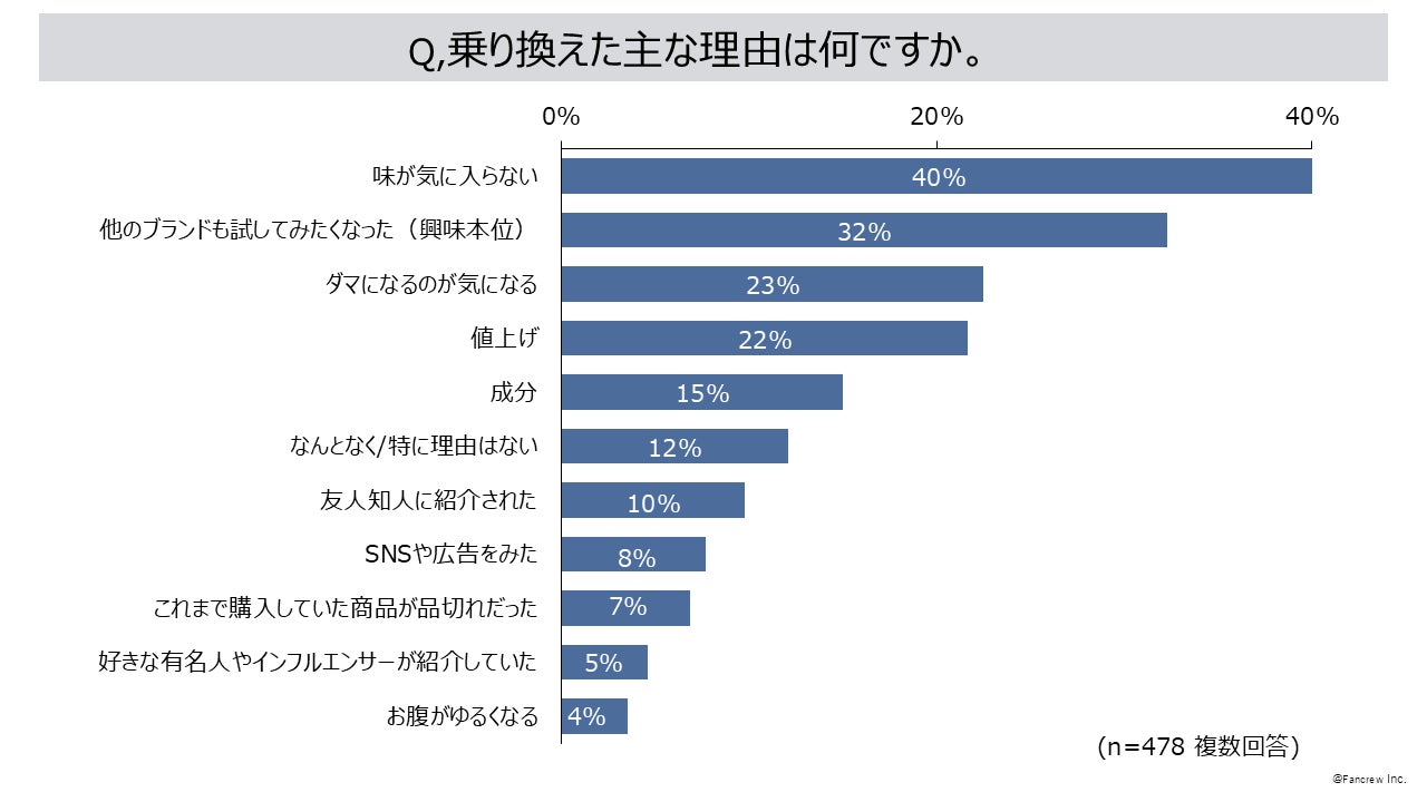 プロテインブランドの乗り換え経験が「ある」49%、乗り換えた最も多い理由は「味が気に入らない」