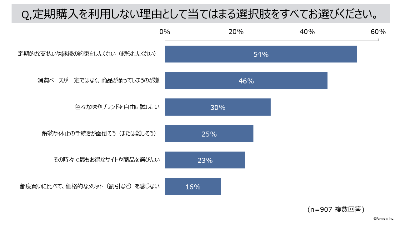 3. プロテインの定期購入を「利用したことがない」93%、理由は「定期的な支払いや継続の約束をしたくない」54%