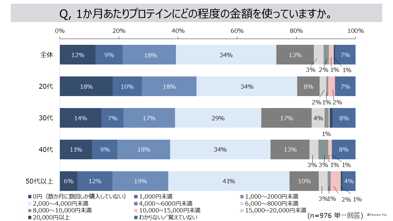 2. 1か月あたりでプロテイン使う金額は「2,000~4,000円未満」が34%と最多