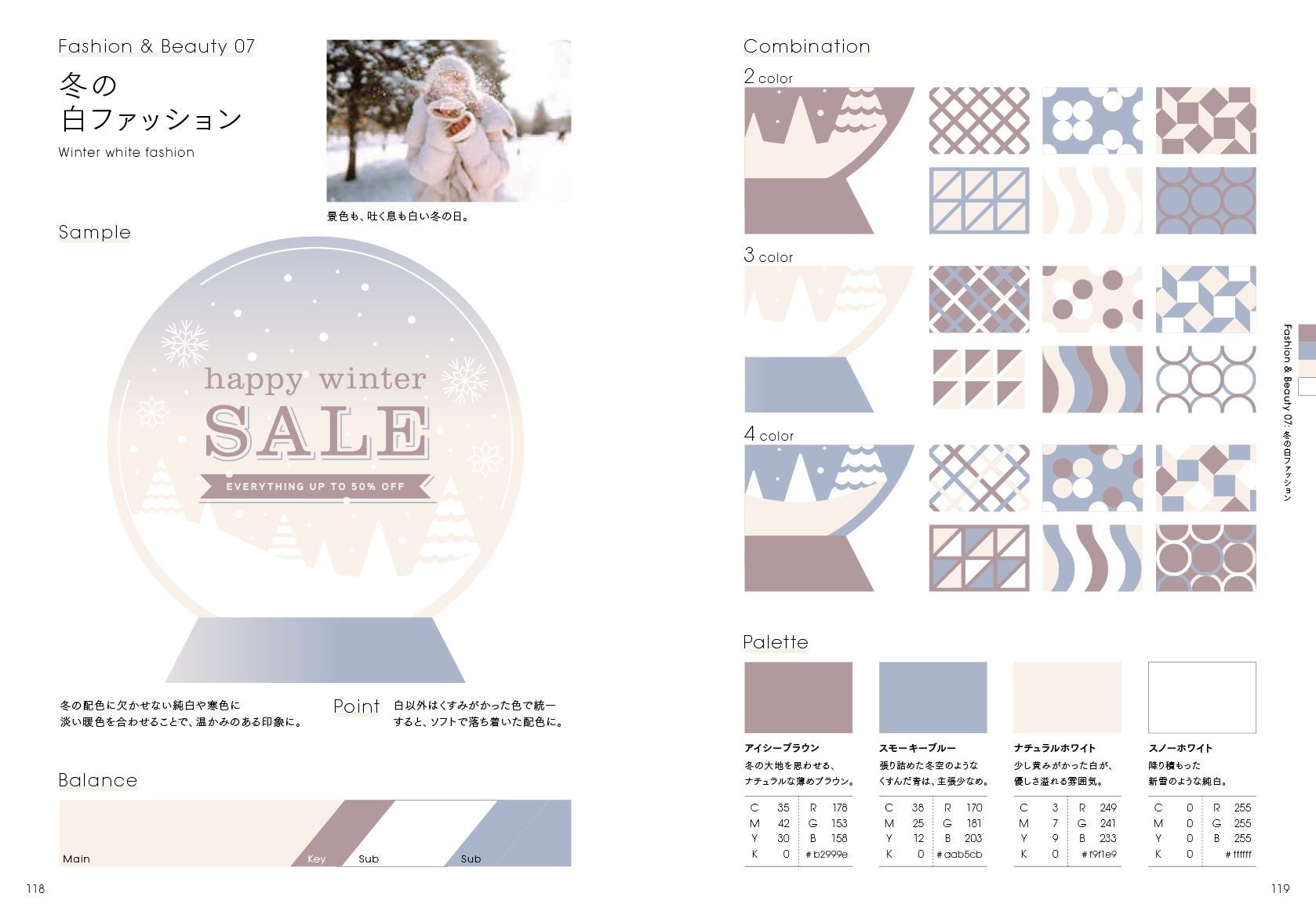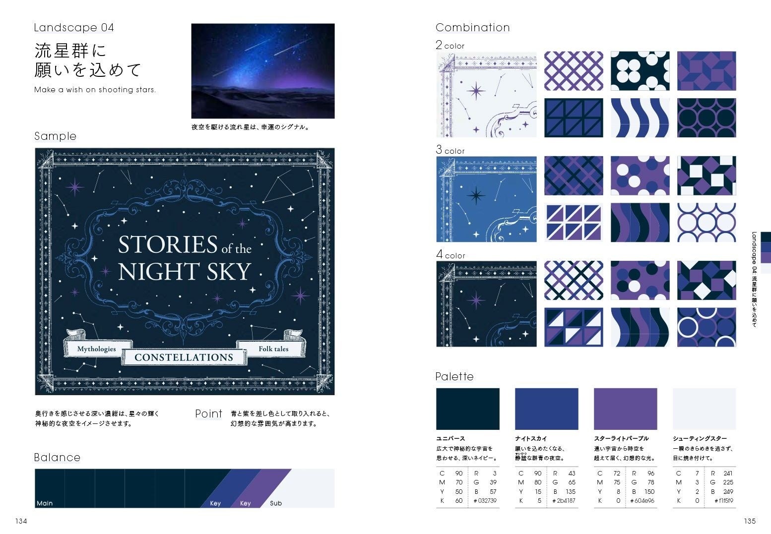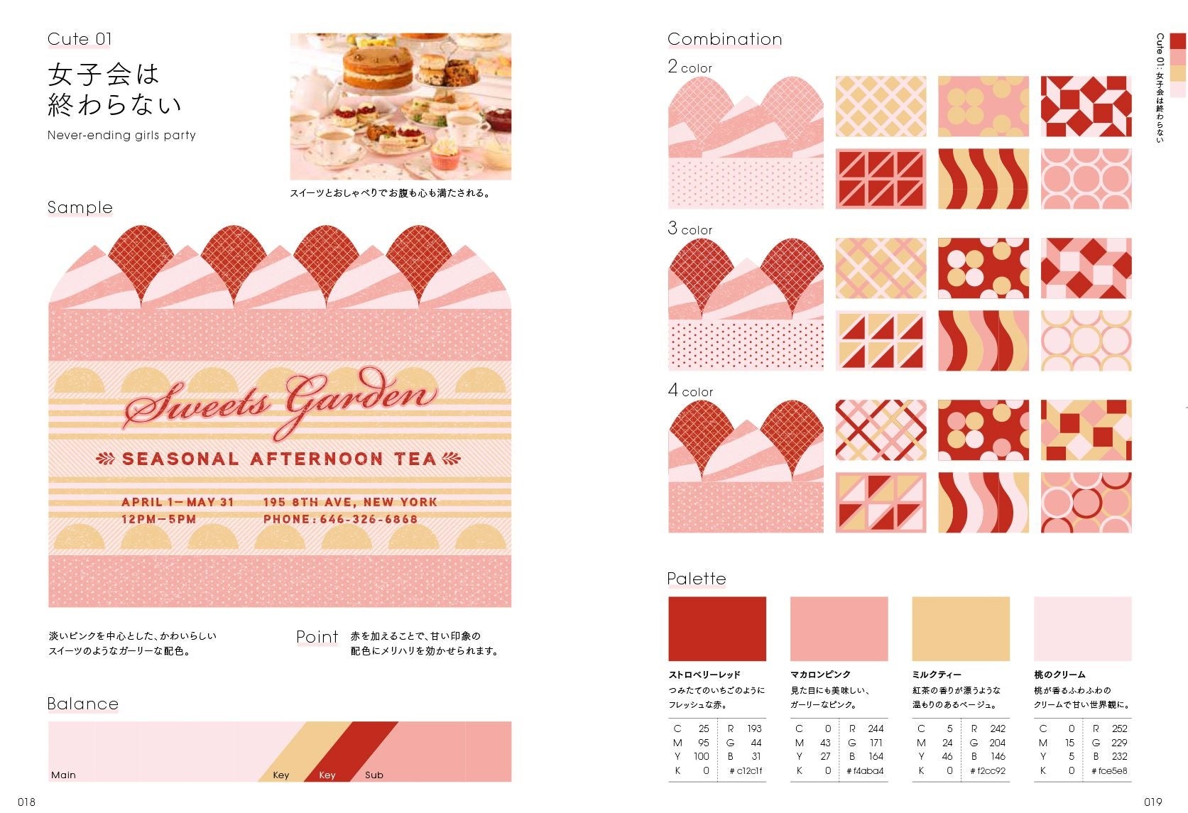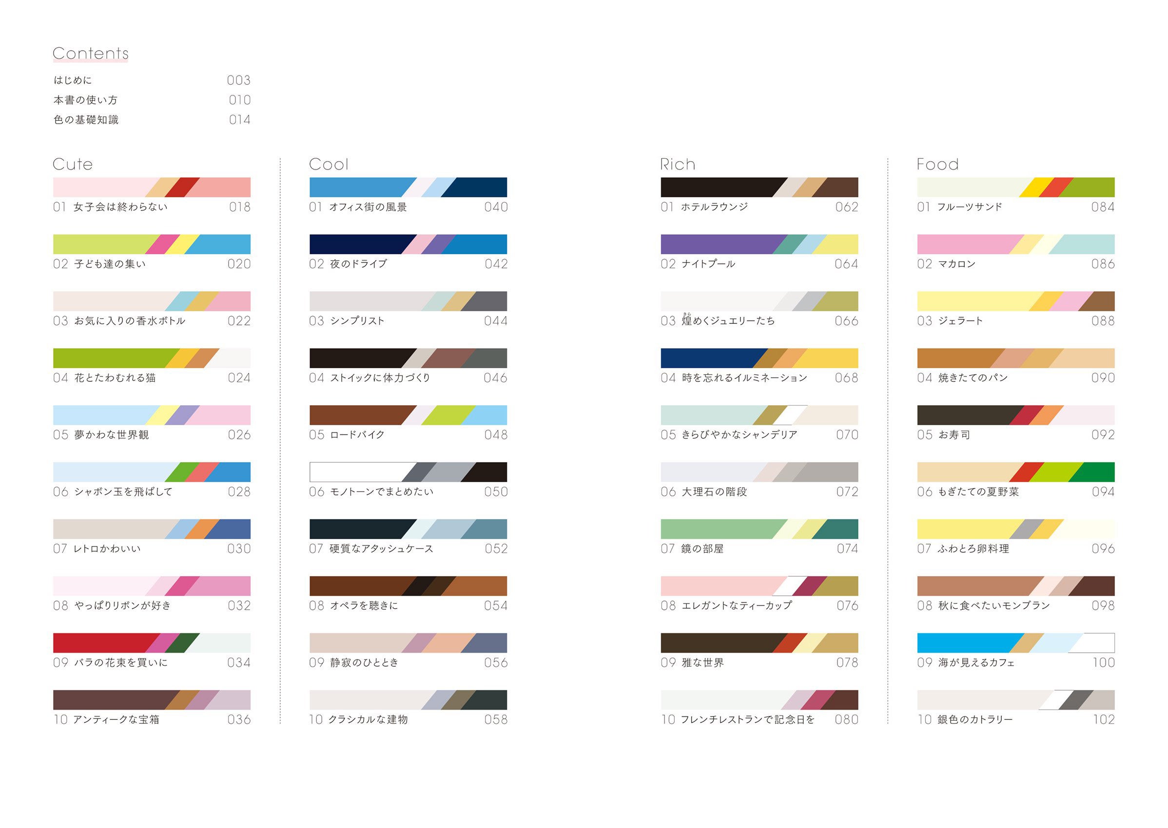 以下のテーマの中に、シチュエーションからふわっとした気持ちまでを、ぎゅぎゅぎゅっと具体的なパターンへ落とし込んだ配色アイデアが豊富に掲載されています。