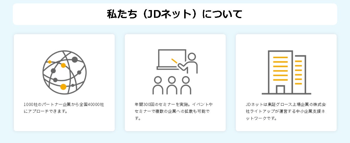 ライトアップが企画・開発・運用を行う全国の中小企業1,000社が参加する経営ネットワーク「JDネット」では、全国の中小企業の黒字化支援を目的に商材の開発・仕入れ・販売を行っています。