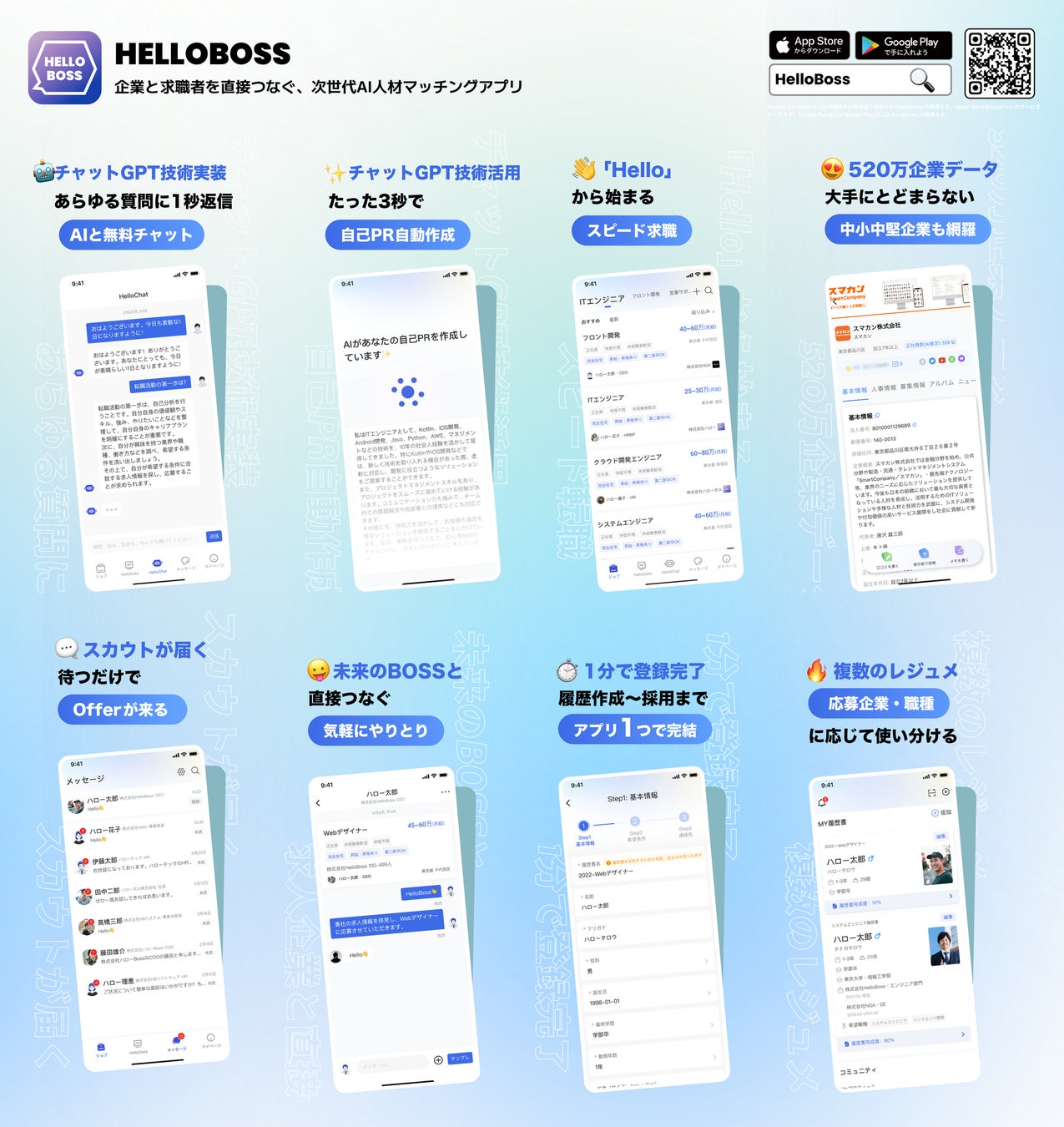 株式会社ライトアップ(本社:東京都渋⾕区、代表取締役社⻑:⽩⽯崇、以下ライトアップ)は、株式会社NGA(本社:東京都港区、CEO:王沁、以下「NGA」)と業務提携し、NGAが提供する企業と求職者を直接つなぐ第3世代AI採用アプリ『HelloBoss』のサービス展開を開始しました。
