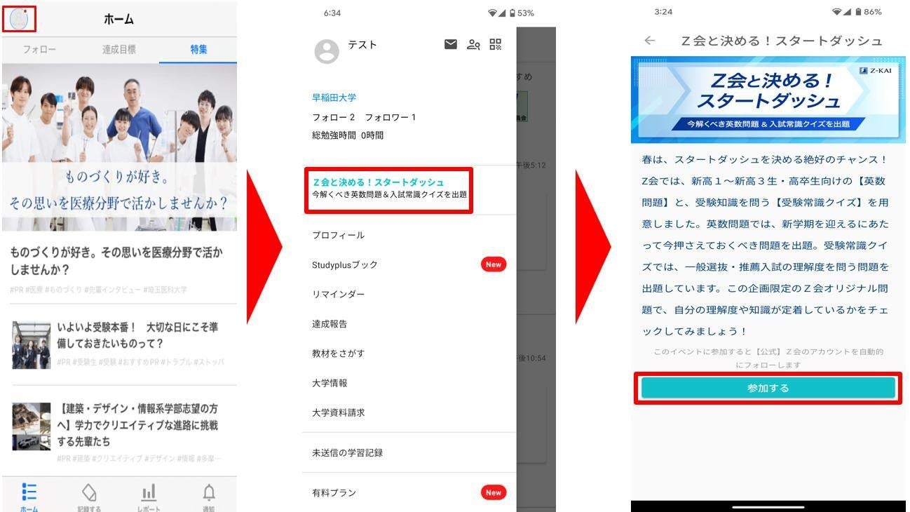 スタディプラス株式会社(本社:東京都千代田区、代表取締役:廣瀬高志、以下スタディプラス)は、株式会社Z会(本社:静岡県三島市、代表取締役社長:藤井孝昭、以下Z会)とのコラボイベント「Z会と決める!スタートダッシュ」を、2025年2月3日(月)から2025年2月28日(金)までの期間限定で学習管理アプリ「Studyplus」内で実施します。