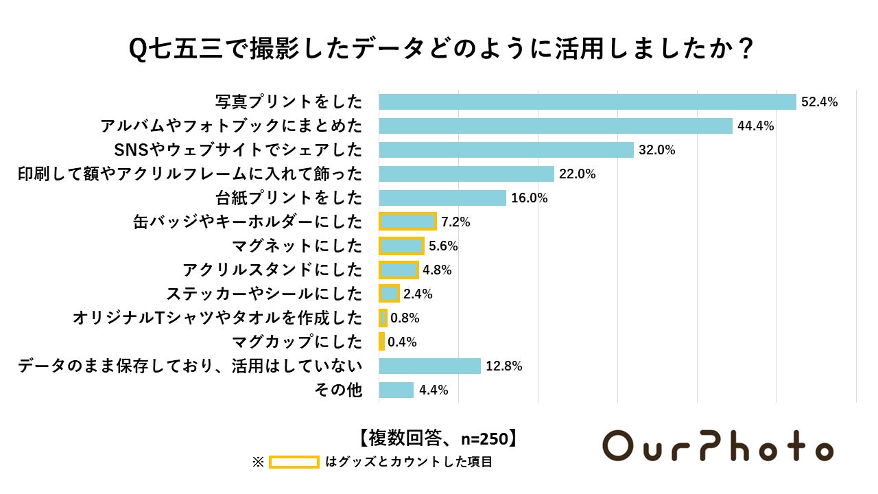 七五三で撮影したデータをどのように活用したか聞いたところ、1位が「写真プリントをした(52.4%)」で半数を超え、次いで「アルバムやフォトブックにまとめた(44.4%)」が2位という結果となりました。また、撮影データをグッズにした人は2割(21.2%)となりました。