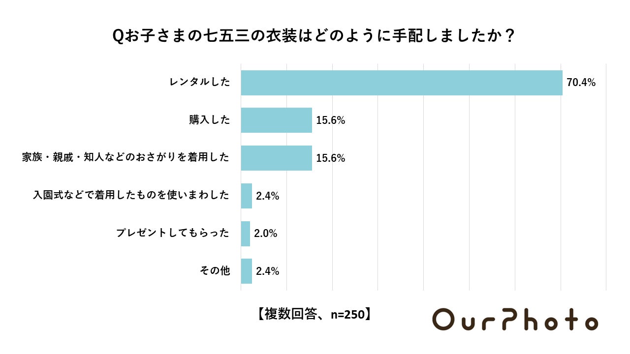 子どもの衣装の手配について聞いたところ、「レンタルした(70.4%)」が1位、「購入した」「家族・親戚・知人などのおさがりを着用した」が15.6%で同率2位という結果となり、約7割がレンタルで手配していたことが分かりました。