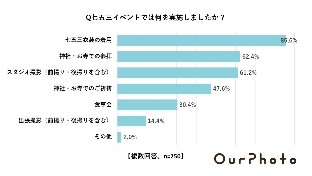 七五三イベントで実施したイベントについて聞いたところ、「七五三衣装の着用(85.6%)」、「神社・お寺での参拝(62.4%)」「スタジオ撮影(前撮り・後撮りを含む)(61.2%)」、の上位3つを6割以上の人が実施しているという結果となりました。