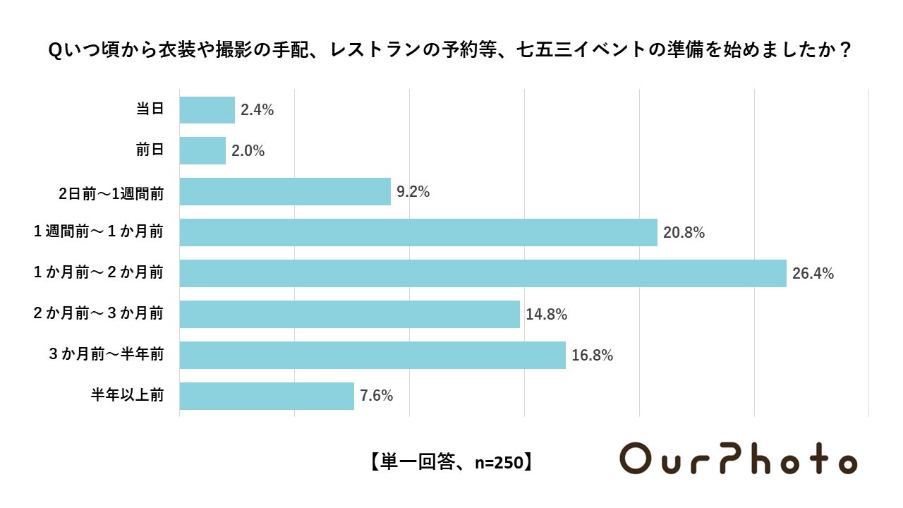 七五三イベントの準備を始めた時期について聞いたところ、最も多かったのが「1か月前~2か月前(26.4%)」、次いで「1週間前~1か月前(20.8%)」、「3か月前~半年前(16.8%)」、「2か月前~3か月前(14.8%)」という結果となりました。