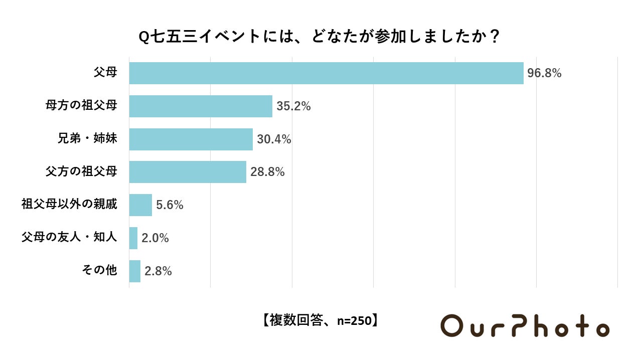 七五三イベントの参加者は「父母(96.8%)」が最も多く、次いで「母方の祖父母(35.2%)」、「兄弟・姉妹(30.4%)」、「父方の祖父母(28.8%)」となり、「父方の祖父母」より「母方の祖父母」の参加が多いことが分かりました。