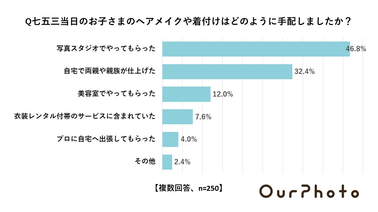 七五三当日の子どものヘアメイクや着付けの手配についての質問に対して、最も多かったのが「写真スタジオでやってもらった(46.8%)」、次いで「自宅で両親や親族が仕上げた(32.4%)」、「美容室でやってもらった(12.0%)」という結果となりました。