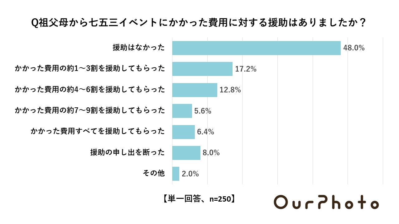 祖父母から費用に対する援助があったかという質問に対し、半数近くは「援助はなかった(48.0%)」と回答し、次いで「かかった費用の約1~3割を援助してもらった(17.2%)」、「かかった費用の約4~6割を援助してもらった(12.8%)」という結果となりました。また「援助はなかった」「援助の申し出を断った」と答えた人は合わせて56.0%となり、お祝い金以外で祖父母から費用の援助を受けていない人が半数を超えることがわかりました。