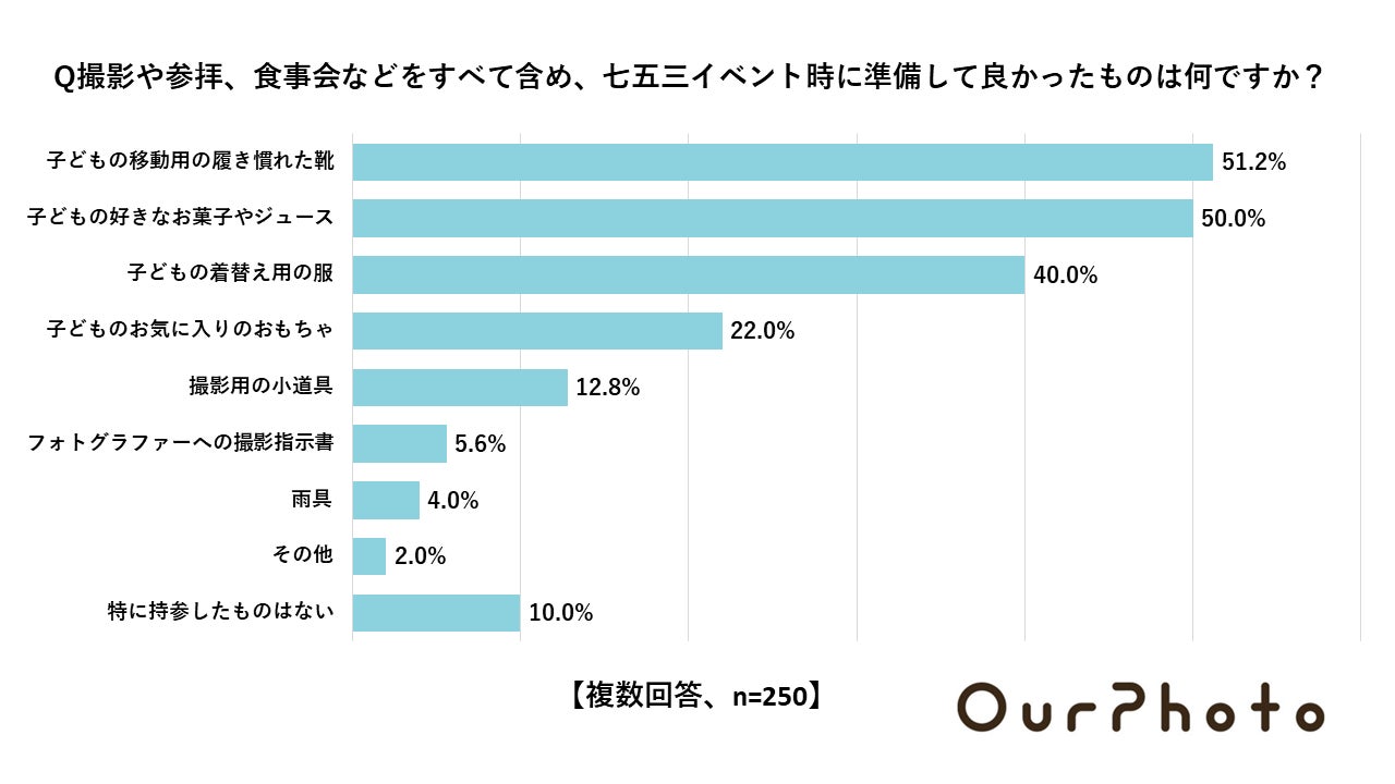 七五三イベント時に準備して良かったものについて聞いたところ、1位「子どもの移動用の履き慣れた靴(51.2%)」、2位「子どもの好きなお菓子やジュース(50.0%)」、3位「子どもの着替え用の服(40.0%)」という結果となりました。