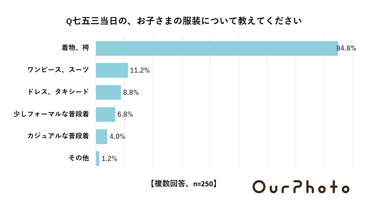 子どもの服装について聞いたところ、「着物、袴(84.8%)」が最も多く、次いで「ワンピース、スーツ(11.2%)」、「ドレス、タキシード(8.8%)」という結果になりました。七五三のイベントに参加する子どもの服装として、伝統的な着物や袴が依然として圧倒的に人気であることが分かります。