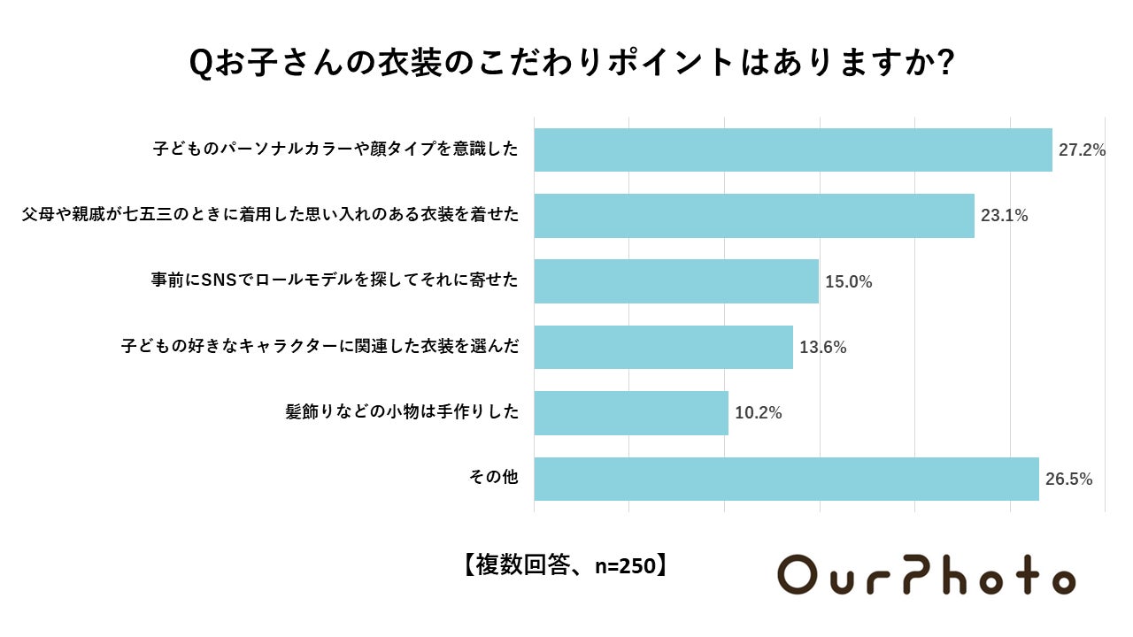 また、お子さんの衣装のこだわりポイントは「子どものパーソナルカラーや顔タイプを意識した(27.2%)」と回答した人が最も多く、自由回答からも「本人が気に入って選んだものにした」という結果が得られました。このことから、子どもの個性にあったオリジナリティ溢れる七五三を実施している人が多いことが伺えます。