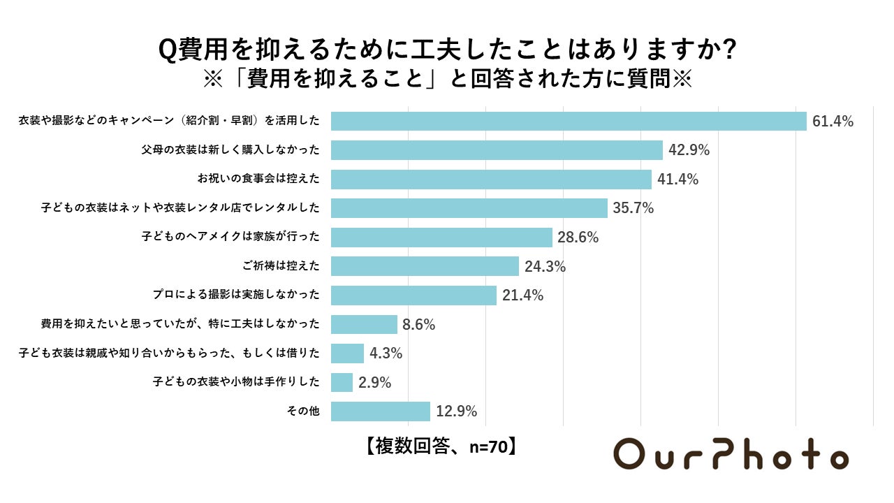 結果14で七五三イベントを実施するにあたり、特に「費用を抑えること」を重視したと回答された方に、費用を抑えるために工夫したことを質問したところ、「衣装や撮影などのキャンペーン(紹介割・早割)を活用した(61.4%)」が最も多く、次いで「父母の衣装は新しく購入しなかった(42.9%)」、「お祝いの食事会は控えた(41.4%)」という結果になりました。その他と回答した人のなかには、「近くの神社を利用したので交通費、祈祷料も抑えられた」「衣装はネットで安いものを購入した」「写真の枚数を減らした」という人もいました。