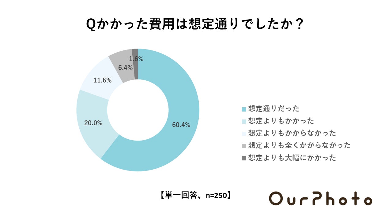 かかった費用に対して想定通りだったか質問したところ、「想定通りだった(60.4%)」が最も多く、次いで「想定よりもかかった(20.0%)」、「想定よりもかからなかった(11.6%)」という結果となり、半数以上の人が予算内で実施していました。