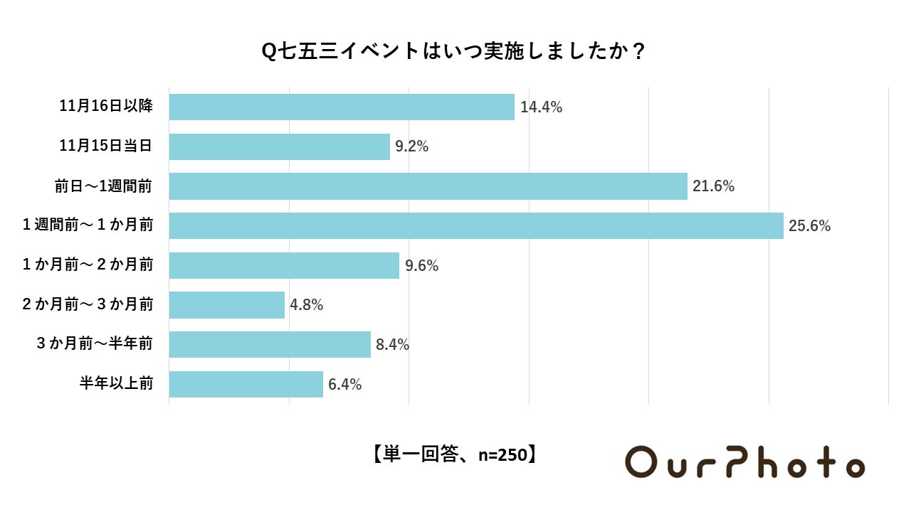七五三イベントの実施時期は、七五三当日の11月15日を起点に、「1週間前~1か月前(25.6%)」が最も多く、次いで「前日~1週間前(21.6%)」が多い結果になりました。