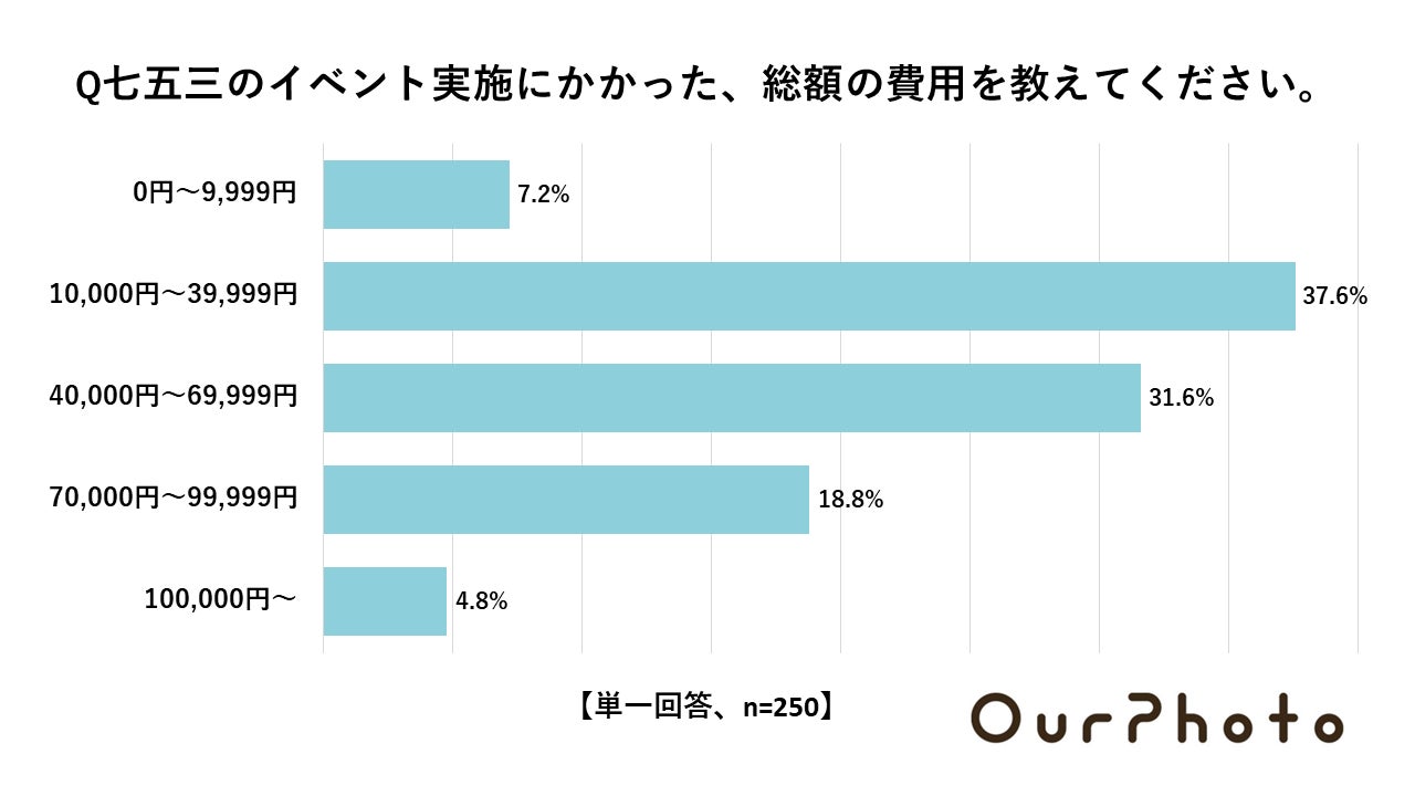 七五三のイベント実施にかかった総額の費用について質問したところ、「10,000円~39,999円(37.6%)」が最も多く、次いで「40,000円~69,999円(31.6%)」という結果となり、昨年と比較して節約傾向が高まっていることが明らかに。<結果11>