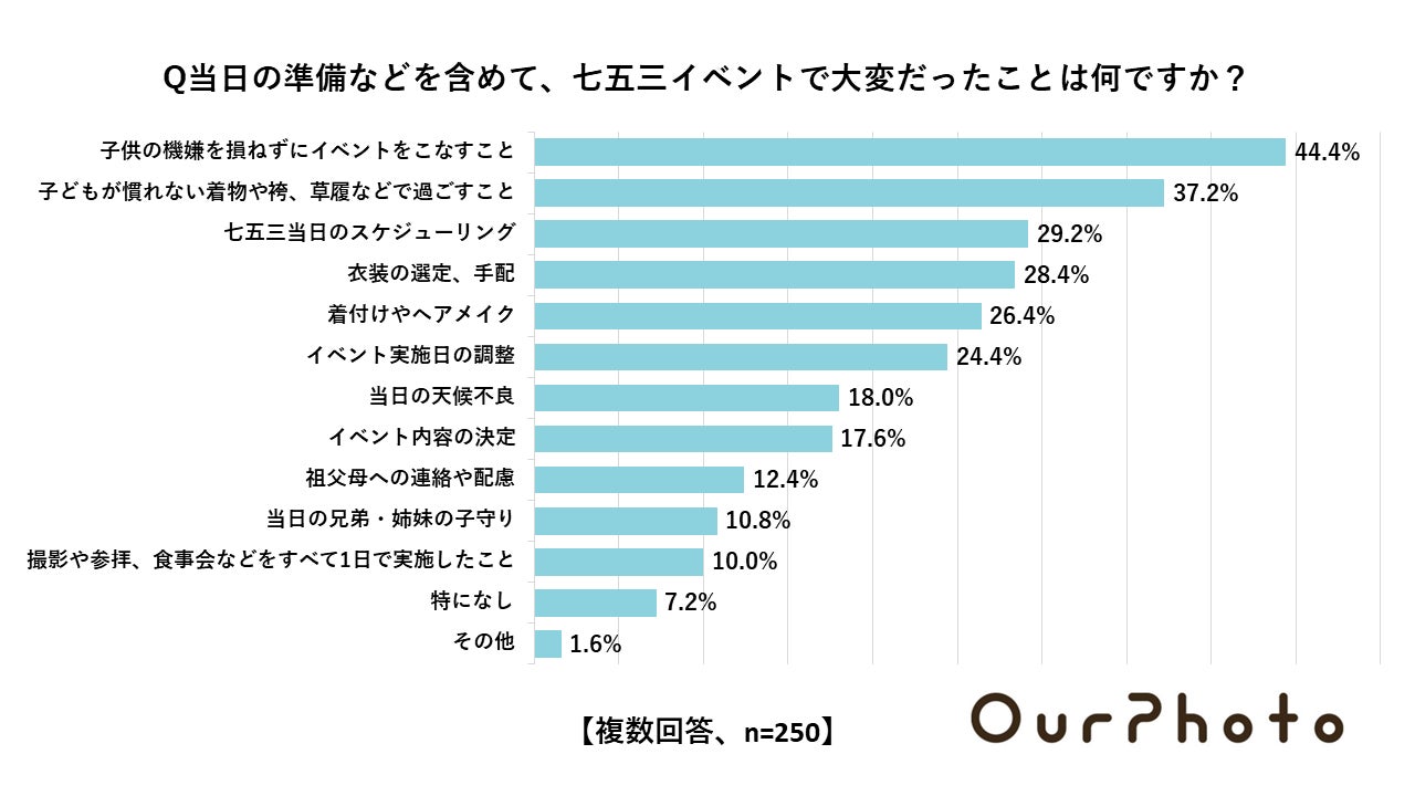 当日や準備などを含めて、七五三イベントで大変だったことについて聞いたところ、「子どもの機嫌を損ねずにイベントをこなすこと(44.4%)」が最も多く、次いで「子どもが慣れない着物や袴、草履などで過ごすこと(37.2%)」、「七五三当日のスケジューリング(29.2%)」、そして「衣装の選定、手配(28.4%)」という結果になりました。