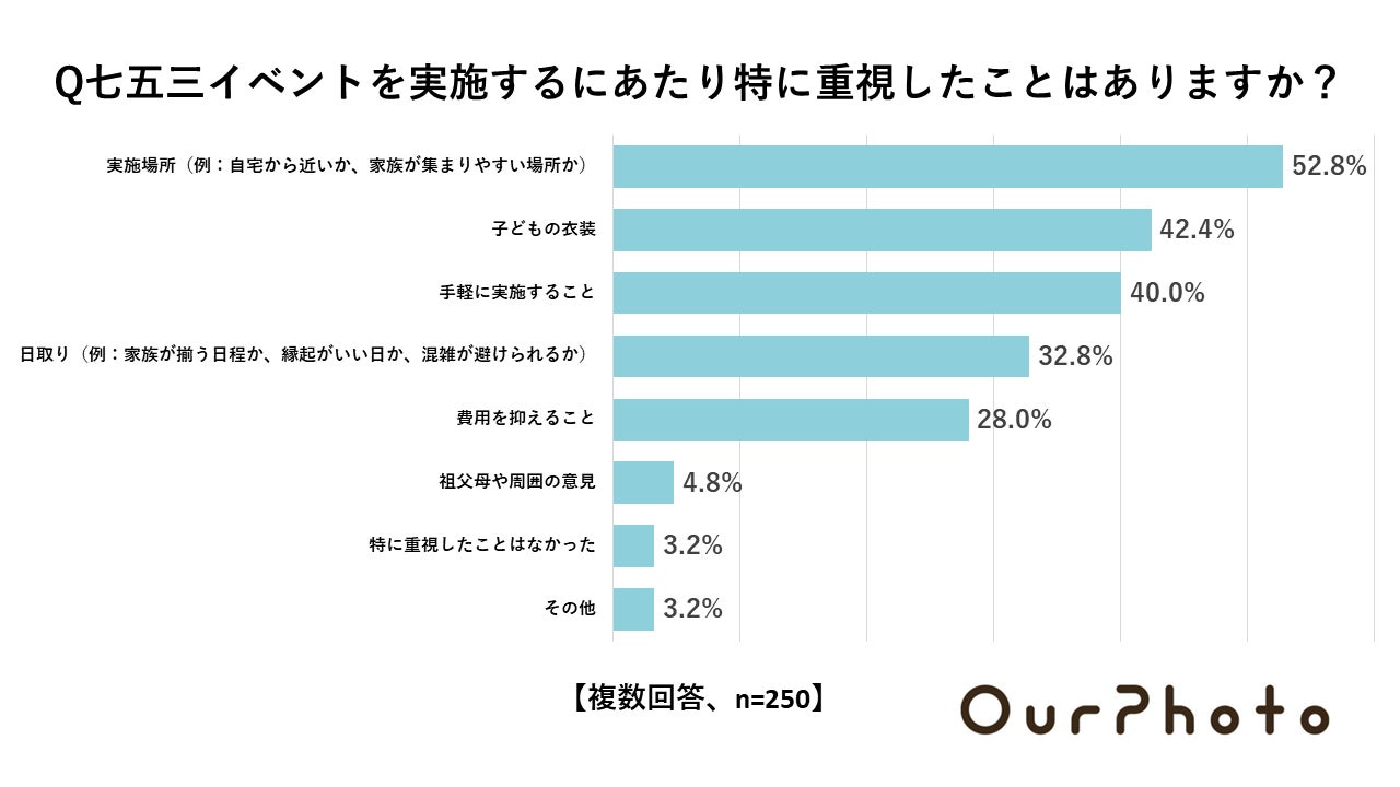 七五三イベントを実施するにあたり特に重視したことについて質問したところ、1位「実施場所(例:自宅から近いか、家族が集まりやすい場所か)(52.8%)」、2位「子どもの衣装(42.4%)」、3位「手軽に実施すること(40.0%)」という結果となりました。