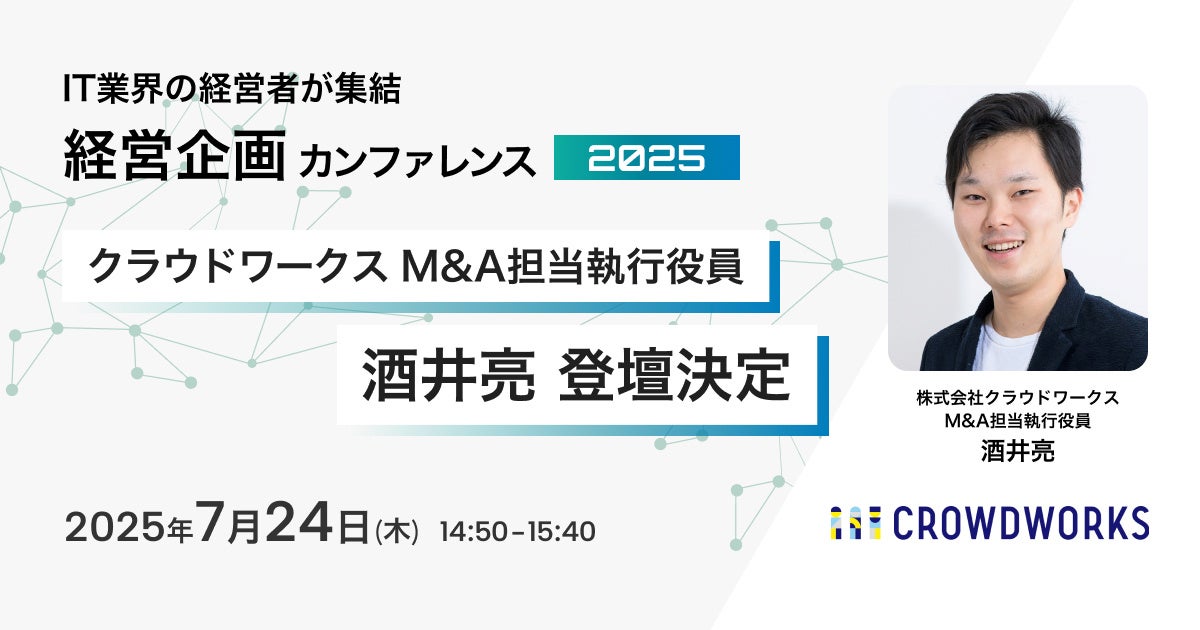 フリーランス業界最大級プラットフォーム(登録ワーカー700万人・登録企業100万社)を基盤に、IT人材&DXコンサルティングサービスを提供する株式会社クラウドワークス(本社:東京都渋谷区 代表取締役社長 兼 CEO:吉田 浩一郎 以下「当社」)は、2025年7月24日(木)に開催される「経営企画カンファレンス2025」に当社M&A担当執行役員 酒井亮が登壇することをお知らせいたします。酒井は、トークセッション5「M&AとPMIの勘所」(以下「本セッション」)にてスピーカーを務めます。