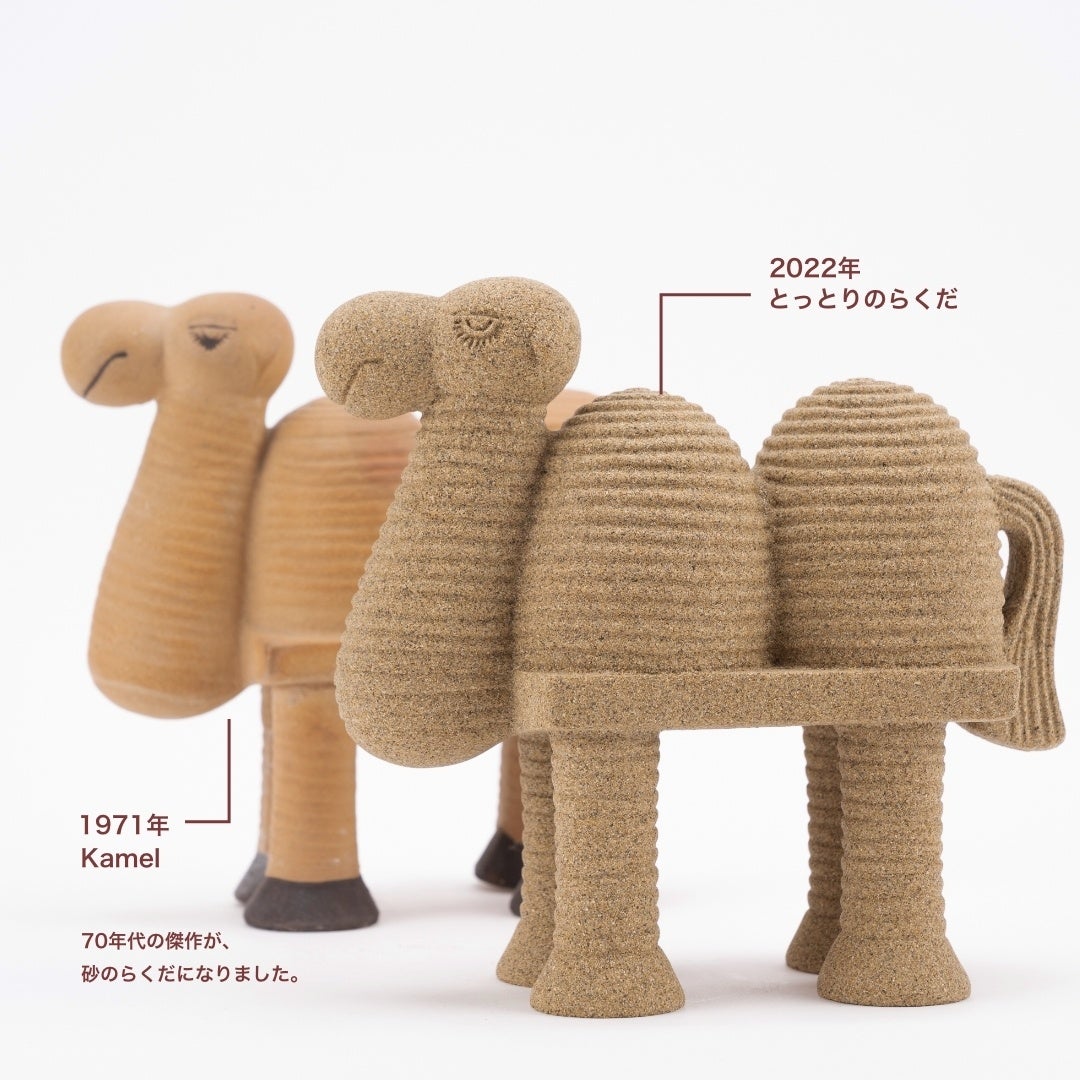 スウェーデンの陶芸家、リサ・ラーソンの70年代の傑作「KAMEL」が鳥取砂丘の砂で現代に蘇った。ラクダが砂で作られるという、「Made in 鳥取」の夢のプロダクツ。