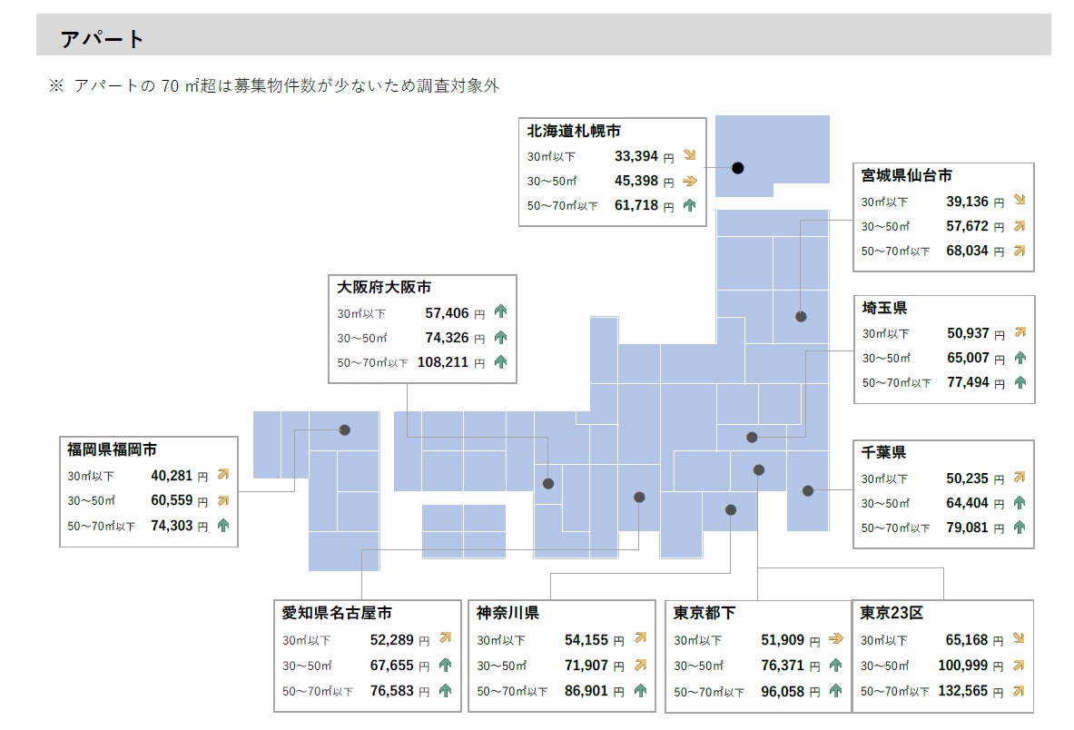・コメントでは、30㎡以下を「シングル向き」、30㎡~50㎡以下を「カップル向き」、50㎡~70㎡以下を「ファミリー向き」、70㎡超を「大型ファミリー向き」としています。