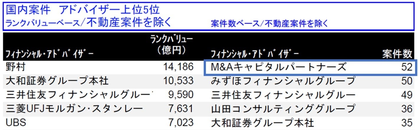・1位獲得「国内案件 アドバイザー上位5位 案件数ベース」 ※下記図を参照