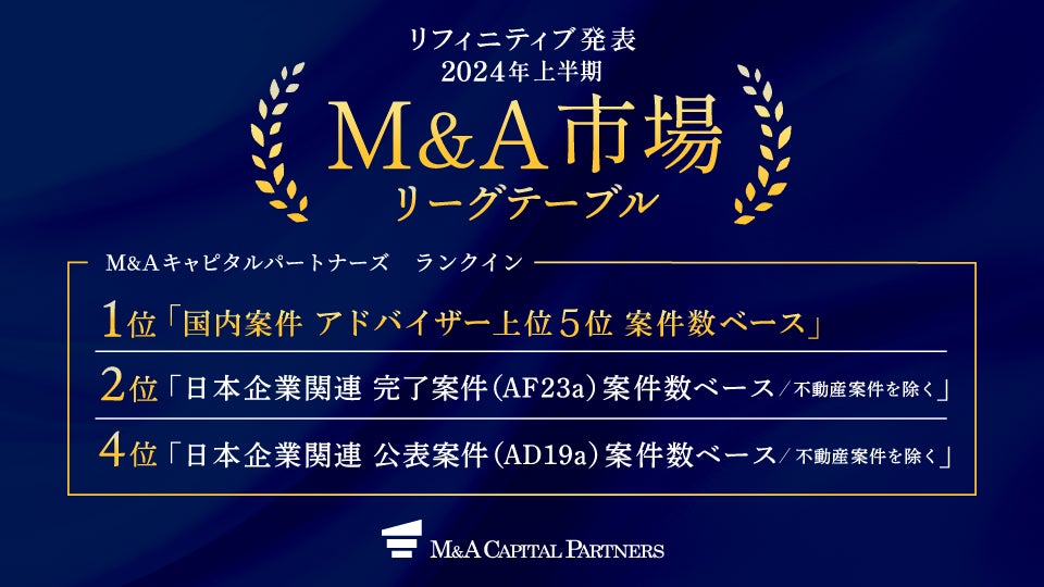 M&Aキャピタルパートナーズ株式会社(東京都中央区・代表取締役社長 中村悟、以降「MACP」)は、LSEG(ロンドン証券取引所グループ、旧リフィニティブ)が発表したM&A市場リーグテーブル「日本M&Aレビュー 2024年 フィナンシャル・アドバイザー」にM&A仲介専業企業として唯一ランクイン※したことをお知らせします。MACPは、「国内案件 案件数ベース」における1位をはじめ、3つのランキングでトップ5以内に入り、「国内案件 案件数ベース」は2023年のM&A市場リーグテーブルに続き、2期連続での1位獲得となります。