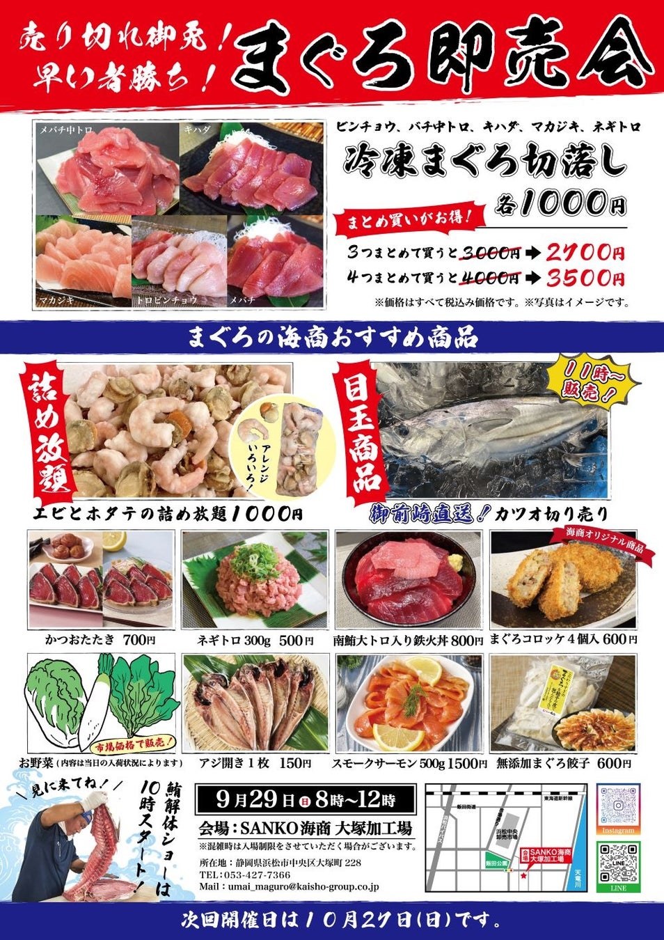 売り切れ必至‼︎ お早めのご来場を!9月29日(日) 浜松仲卸「まぐろの海商」の「まぐろ解体ショー&即売会」