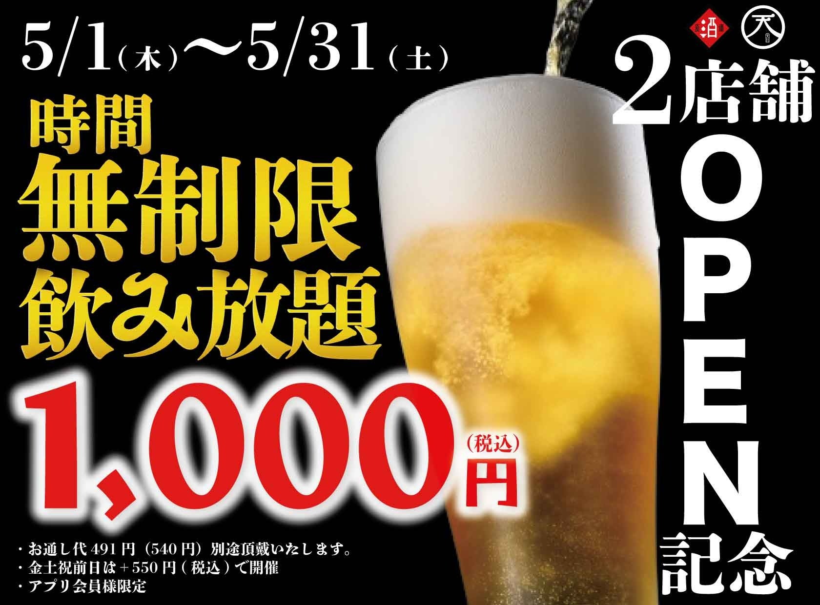 【最大11時間30種飲み放題¥1,000】2店舗OPEN記念祭!|『時間無制限飲み放題¥1,000』イベントを5月限定開催!|個室居酒屋 天日 本厚木店、日本酒原価酒蔵 町田店