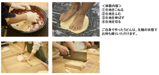 青空の下で、うどんづくり体験を。30分程度で、手づくりうどんを体験し、作ったうどんは生麺の状態でお持ち帰りいただけます。参加費は無料。小学生以下のお子さま限定のコンテンツとなります。