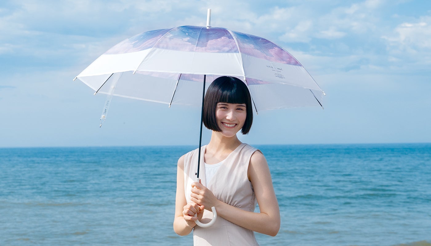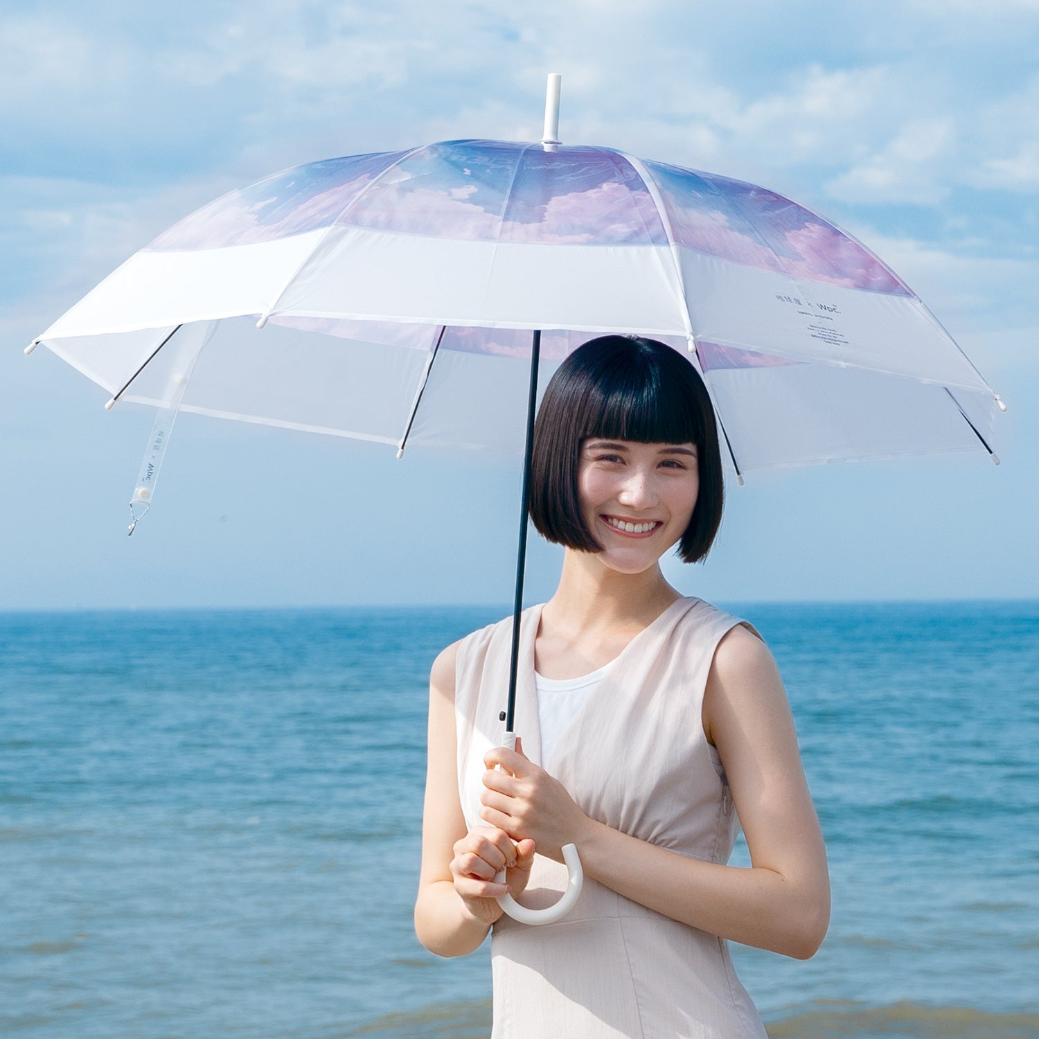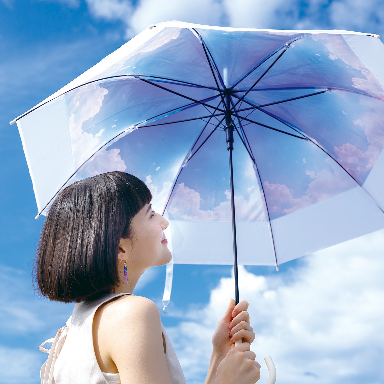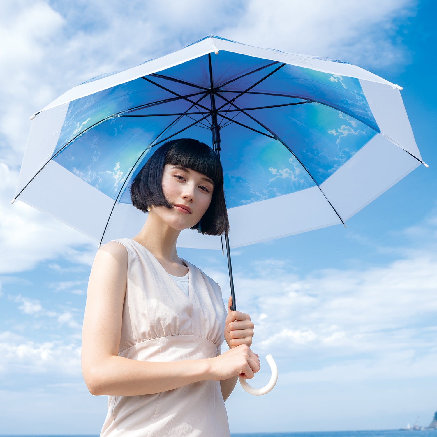 移り変わってゆく一瞬の空模様を切り取ったような空色アンブレラをさしながら、雨空を見上げてみてはいかがでしょうか?