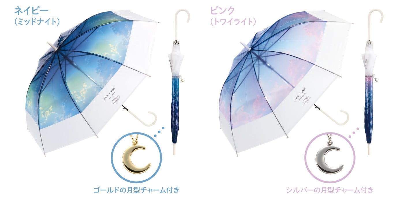 Wpc.が初めてコラボレーションするのは自然の美しさをレジンで表現するアクセサリー作家・地球屋。その幻想的な世界はSNSを中心に多くの人々を癒し、魅了しています。今回、地球屋のなかで人気の高い”空に浮かぶ雲”の2作品をモチーフにしたビニール傘が誕生。真夜中の静けさを感じさせる深いネイビーを基調に、落ち着いた雰囲気を放つ”ネイビー/ミッドナイト”、黄昏時の空の色が溶け合う瞬間を淡いピンクやパープル、ブルーで表した”ピンク/トワイライト“の2色展開で、大きく広がる雲が印象的です。また空を優しく照らす月形チャームがムードを高めてくれます。