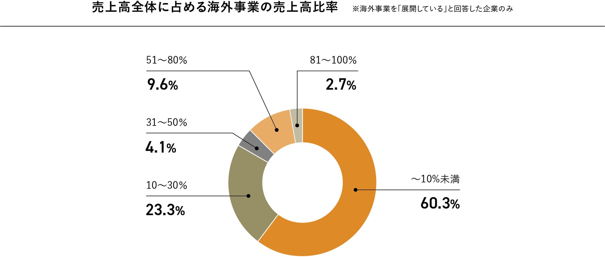 (2)海外事業を展開している企業において、売上高全体に占める海外事業の売上高比率は「10%未満」と回答した企業が60.3%と最多。売上構成のうえでは依然として国内市場への依存が強く、海外事業は補完的な位置づけにとどまっている企業が多いことが明らかとなりました。
