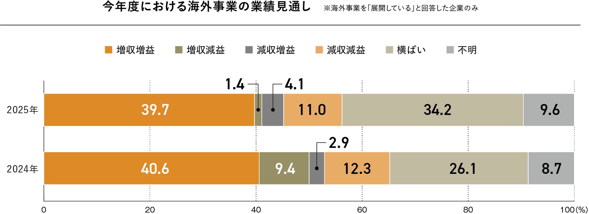 海外事業の業績見通しについて、「増収増益」と回答した企業は39.7%と最も多く、前年度(40.6%)とほぼ同水準にとどまりました。企業の約4割が成長を維持すると見込んでおり、一定の堅調さがうかがえます。一方、「横ばい」と回答した企業は34.2%と前年(26.1%)から8.1ポイント上昇し、業績は横ばい傾向が強まっています。「減収減益」は11.0%、「減収増益」は4.1%であり、大幅な業績悪化を見込む企業は一部にとどまる結果となりました。また、「増収減益」は1.4%にとどまり、前年の9.4%から大きく減少となりました。