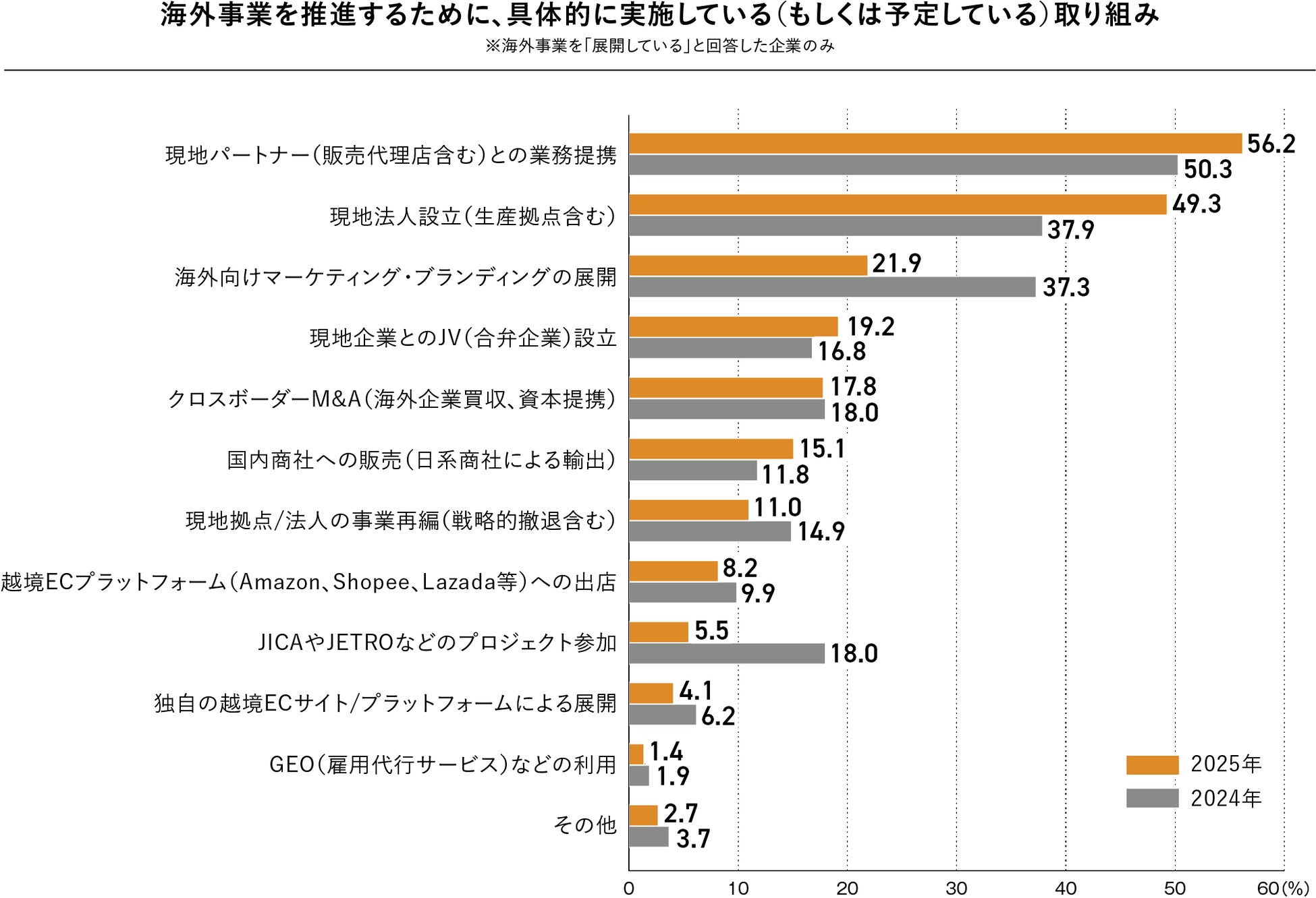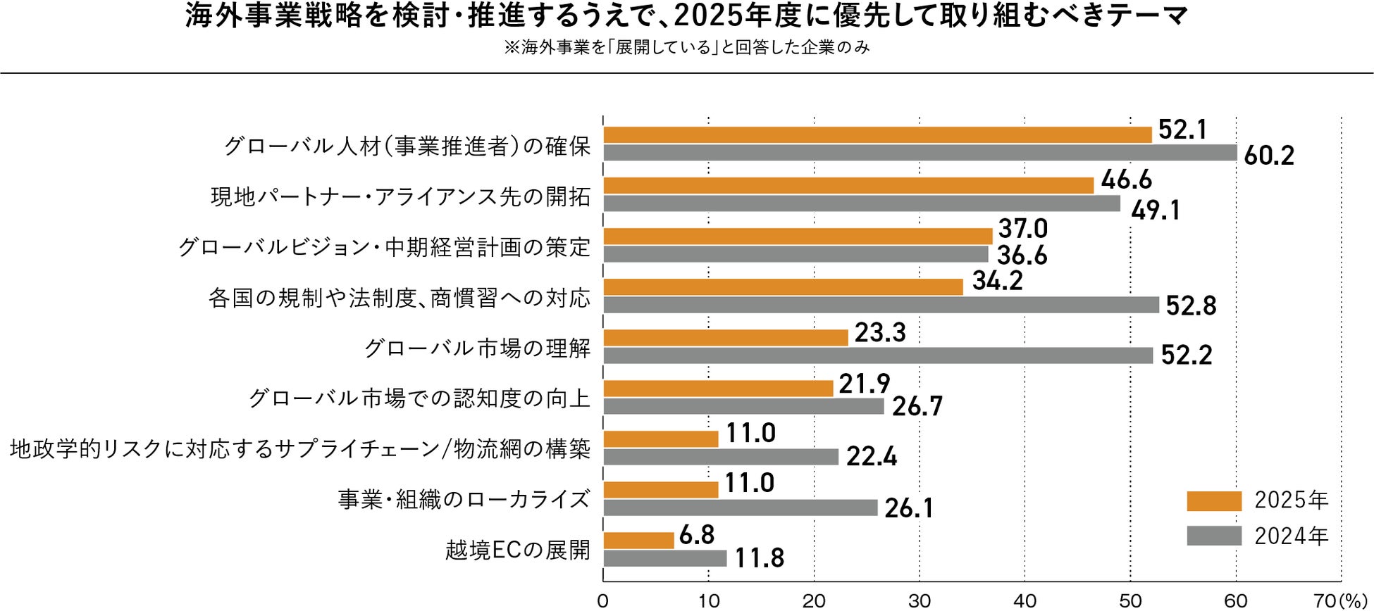 一方で、2024年度には上位を占めていた「各国の規制や法制度、商慣習への対応」(2024年度52.8%)や「グローバル市場の理解」(2024年度52.2%)が、2025年度にはそれぞれ34.2%、23.3%へと大きく減少しました。制度理解や市場リサーチといった前提作業がある程度進んだ企業が増えたものの、これは実行段階へシフトしていることが背景にあると考えられます。また、「グローバル市場での認知度の向上」(21.9%)、「地政学的リスクに対応するサプライチェーン/物流網の構築」(11.0%)、「事業・組織のローカライズ」(11.0%)といった項目も、前年から大きく低下。テーマの優先順位が“環境整備”から“パートナーの確保”へと変化している様子がうかがえます。