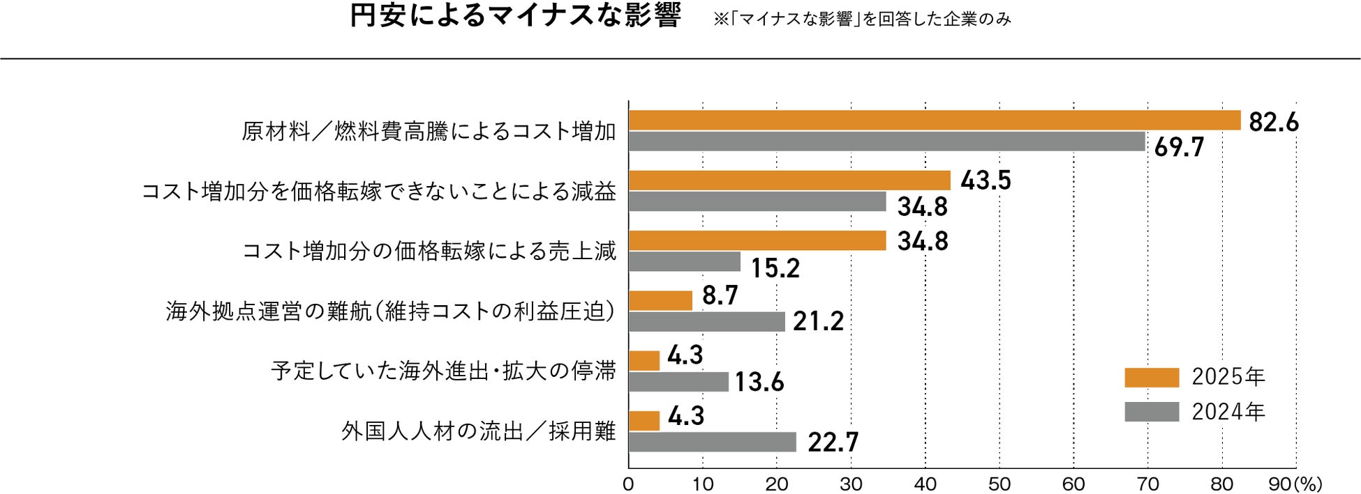 円安によるマイナスの影響として最も多かったのは、「原材料/燃料費高騰によるコスト増加」(82.6%)となりました。次いで、「コスト増加分を価格転嫁できないことによる減益」(43.5%)、「価格転嫁による売上減」(34.8%)と続き、仕入コストの上昇が企業の利益を圧迫していることが分かります。円安が収益性に与える負の影響が、コスト構造へのダメージとして表れる結果となりました。特に輸入依存度の高い製品や原材料を扱う企業にとっては深刻な課題です。その一方で、「海外拠点運営の難航(維持コストの利益圧迫)」(8.7%)、「予定していた海外進出・拡大の停滞」(4.3%)、「外国人人材の流出・採用難」(4.3%)は前年から大きく減少しており、円安による人材・運営面での混乱には沈静化の兆しが見てとれます。