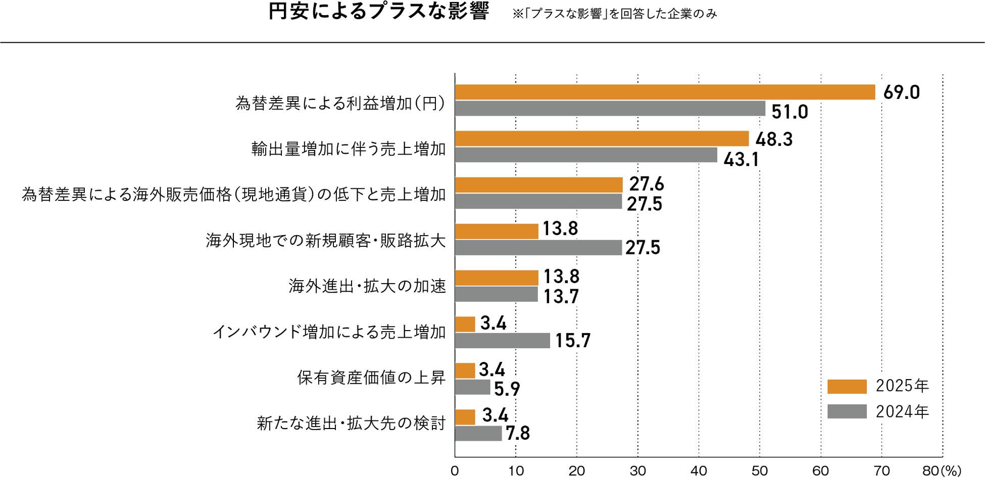 円安によるプラスの影響として最も多く挙げられたのは、「為替差異による利益増加(円)」であり、69.0%に達しました。前年(51.0%)から大きく上昇しており、会計上の為替差益が企業収益に寄与している状況がうかがえます。次いで「輸出量増加に伴う売上増加」(48.3%)、「為替差異による海外販売価格(現地通貨)の低下と売上増加」(27.6%)が続き、いずれも円安による価格競争力の向上を通じて、売上増加につながっています。一方で、「海外現地での新規顧客・販路拡大」(13.8%)や「インバウンド増加による売上増加」(3.4%)は前年より大きく減少しており、円安による短期的な利益押し上げに一服感がうかがえます。構造的な需要の拡大にはつながっていないのが実態です。
