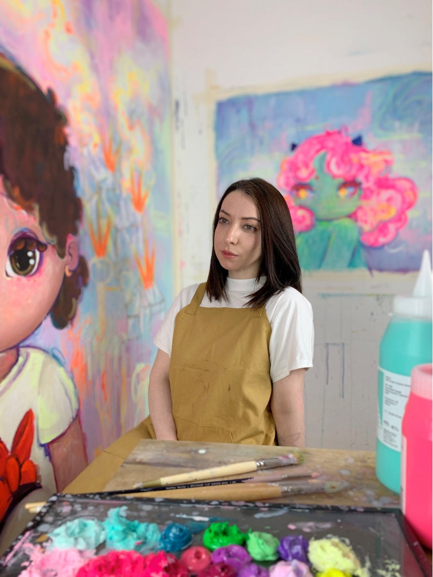 彼女の絵画スタイルはローブローアートに触発されており、日本の漫画、アメリカのカートゥーン、ストリートカルチャーの影響を反映しています。