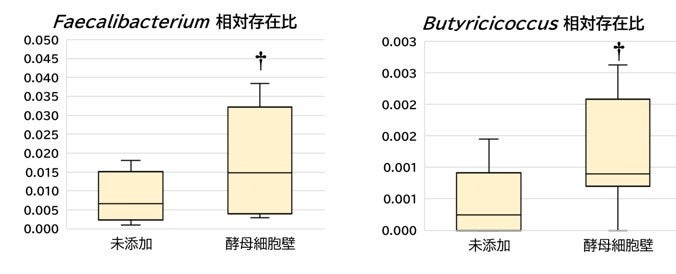 パン酵母由来の酵母細胞壁を添加することにより、培養液中に含まれる短鎖脂肪酸(酢酸・プロピオン酸・酪酸)の濃度が、未添加時と比較して有意に高い値を示すことが分かりました (図3) 。 また、培養後の腸内フローラを解析したところ、パン酵母由来の酵母細胞壁の添加により、酪酸を産生する菌であるFaecalibacterium属およびButyricicoccus属の相対存在比について増加傾向が認められました(図4)。以上の結果より、パン酵母由来の酵母細胞壁は、短鎖脂肪酸の産生を増強することが明らかになりました。特に酪酸においては、基質となる酢酸増加および、酪酸産生菌を増やすことの双方から酪酸産生を増強することが示唆されました。