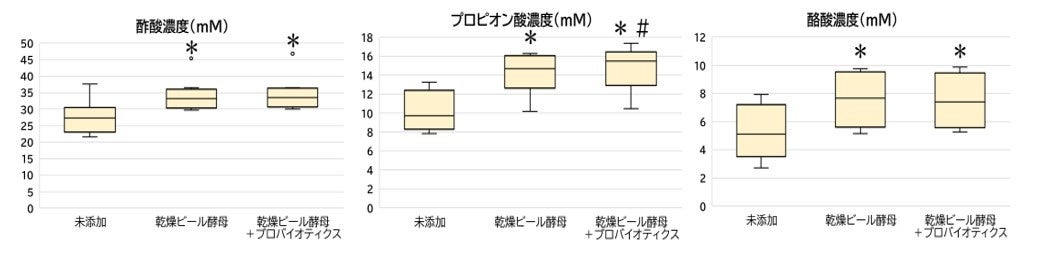 また、乾燥ビール酵母と同時に、プロバイオティクス素材※4であるアシドフィルス菌、フェカリス菌、ビフィズス菌を添加すると、乾燥ビール酵母だけを添加した時と同様に、短鎖脂肪酸(酢酸・プロピオン酸・酪酸)の濃度が、未添加時と比較して有意に高い値を示しました(図2)。さらに、乾燥ビール酵母のみを添加した結果と乾燥ビール酵母+プロバイオティクス素材を添加した結果を比較したところ、プロバイオティクス素材を同時に添加することで、プロピオン酸の産生がさらに増強されることが分かりました(図2)。(p=0.028)