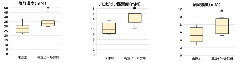 乾燥ビール酵母を添加することにより、培養液中に含まれる短鎖脂肪酸(酢酸・プロピオン酸・酪酸)の濃度が、未添加時と比較して有意に高い値を示すことが分かりました(図1)。また、培養後の腸内フローラを解析したところ、細菌の平均相対存在比に有意な変化は見られませんでした。以上の結果より、乾燥ビール酵母は、短鎖脂肪酸の産生増強に寄与することが示唆されました。
