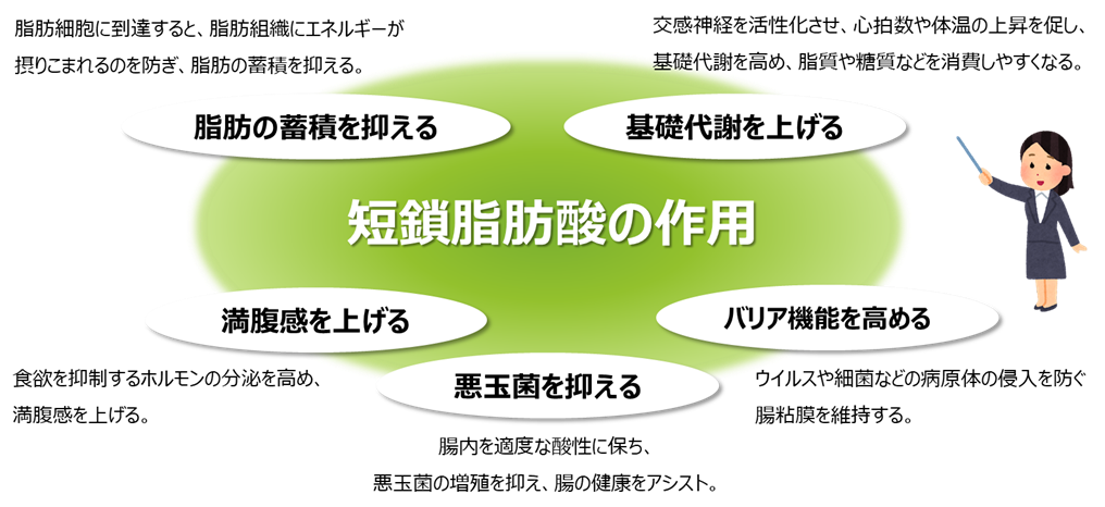 腸内細菌によって作られる有機酸のうち、炭素の数が6個以下のものを指す。酢酸、プロピオン酸、酪酸などがある。腸内細菌が食物繊維を分解することで産生される。腸内を弱酸性環境にすることで、有害な菌の増殖抑制・蠕動運動促進・免疫反応の制御に関与すると考えられている。