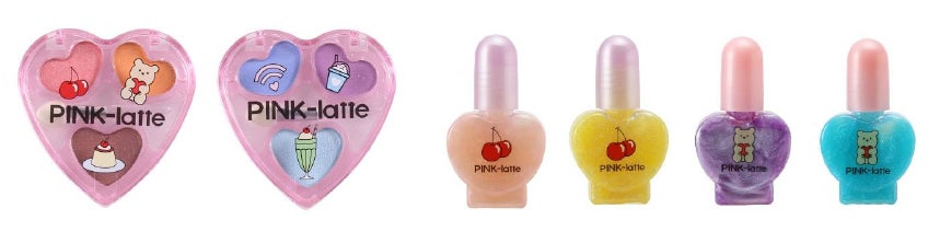 「ピンク ラテ」 くまポーチ 全2種、ショルダーポーチ 全2種、クリアキューブポーチ 全5種、シュシュ 全4種、ヘアゴム 全2種、リップクリーム 全4種、水溶性ネイル 全4種、リップグロス(ケース) 全4種、リップグロス(スティック) 全4種、ネイルチップ 全1種、アイシャドウパレット 全2種