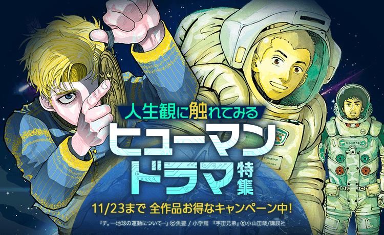 「ヒューマンドラマ特集」では、『チ。―地球の運動について―』(小学館)や『宇宙兄弟』(講談社)など、登場人物の人生観に触れることのできる選りすぐりの作品を多数ご用意しました。