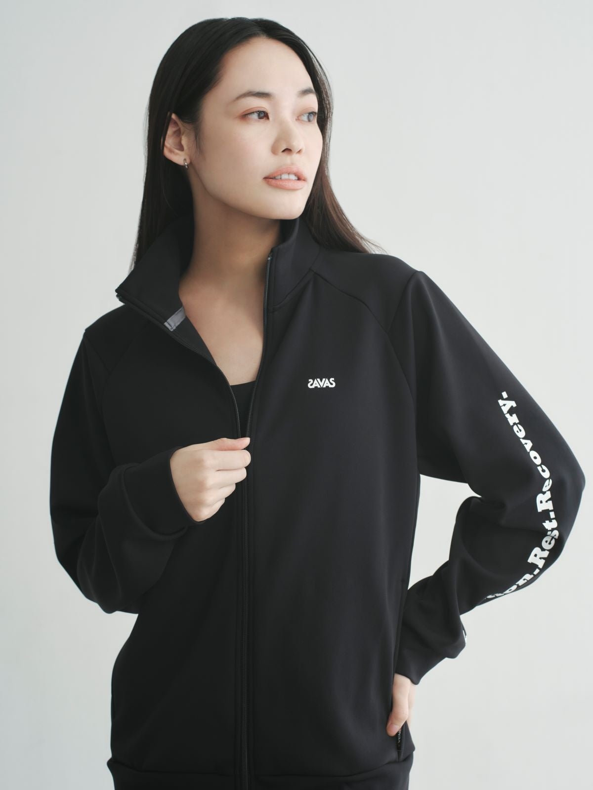 胸元に「ザバス」のLOGO、左腕にコラボレーションコンセプト「Nutrition.Rest.Recovery.」(栄養・休養・回復)のメッセージがあしらわれています。