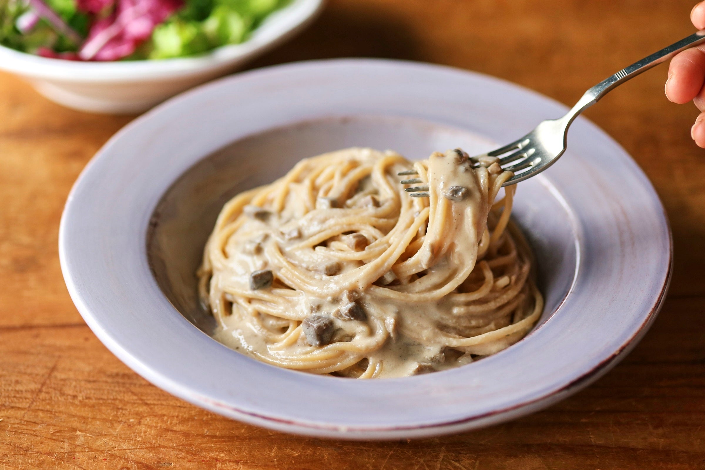 きのこのおいしさとクリーミーなコクが楽しめるソース。食感が楽しいエリンギと、旨みたっぷりのえのき・マッシュルームの「3種類のまるごときのこ」のおいしさが存分に楽しめるように作りました。じっくり炒めたたまねぎとナッツの、やさしい甘みとコクが加わり、濃厚なクリームソースに仕上げました。