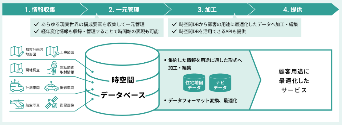 ゼンリンの様々なソリューションを支えているのは独自の「時空間データベース」です。その中心にあるのが、「地物」という考え方です。道路や建物、信号機といった目に見えるものだけでなく、行政界、地名といった目に見えないものまで、名前(種別)を付与して表現しています。さらに、「いつ」の状態であるかという時間軸も含めてデータを管理しています。これにより経年変化を捉え、過去・現在・未来を通じた高度な活用が可能となっています。