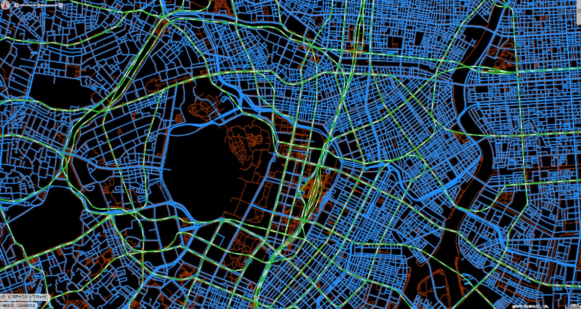 今回展示する「Mobility based Network」は「時空間データベース」からの自動生成が可能で、業界屈指の網羅性と精度を誇るネットワークデータです。自動車道路から公共交通(電車・バス・フェリー)、さらに駅構内や地下街などの歩行者専用通路まで、移動にかかわる日本全国のあらゆる通路と、それらを接続する交通結節点の情報を組み合わせて管理しています。様々な次世代モビリティを支えるデータ基盤として新たな価値を提供します。